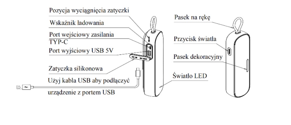 1. Ładowanie produktu: Otwórz silikonową zatyczkę, jak pokazano na rysunku, włóż kabel zasilający USB do portu wyjściowego USB zasilacza, a drugi koniec do gniazda typu C 5V produktu, aby dostarczyć zasilanie i naładować wewnętrzną baterię litową, gdy miga czerwony wskaźnik – tryb ładowania, po pełnym naładowaniu – wskaźnik świeci na czerwono.